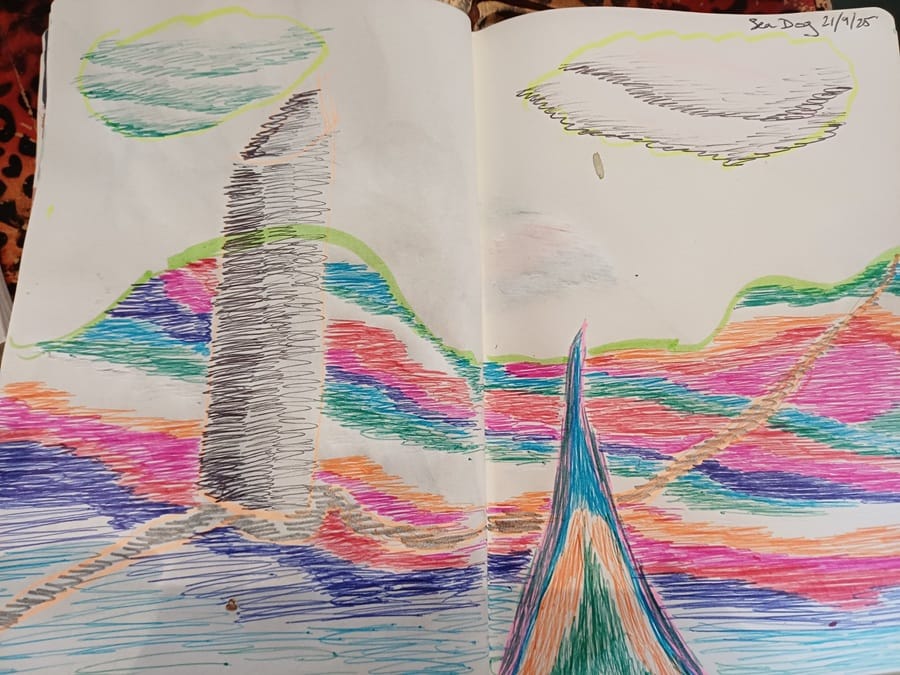 Exmouth has the Sea Dog Art Gallery / Cafe, where our Exe Painting and Drawing Meetup often meets. And there I painted a tentacle in bright colours. The cafe offers painting in acrylic for a variety of clay models and the price (I paid £8) includes the firing of the clay model.